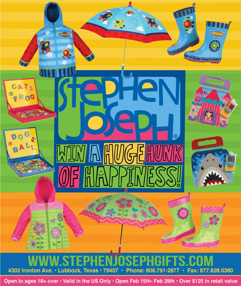 Welcome to the Stephen Joseph Prize Pack Giveaway! Stephen Joseph is giving away a prize pack that includes a Rain Coat, Rain boots, Umbrella, Magnetic spell & count set, and Shaped Sketch pad and these can all be personalized to your kids names/gender!!!Now for the giveaway! One lucky winner will receive (Can choose girl/boy) Rain Coat, Rain boots, Umbrella, Magnetic spell & count set, and Shaped Sketch pad (personalized with name), over $125 Value!Open to US only Only one entrant per household/IP address Giveaway ends 2/29/2016 at 11:59pm EST