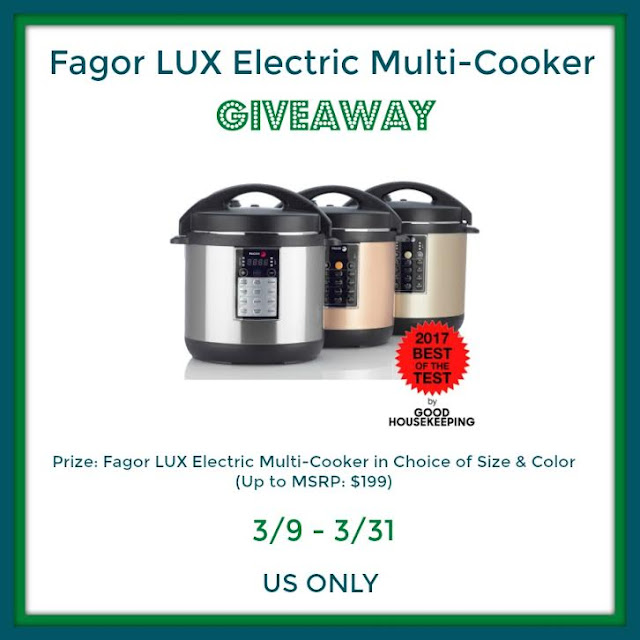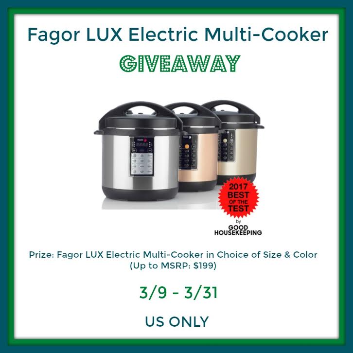 Even when your brackets get busted everyone around the TV can still be a winner when you serve Foster Farms Corn Dogs or Mini Corn Dogs. They’re the ultimate “Snack-Time Bracket Busters”! #FFBracketBusters Foster Farms corn dogs come in three great flavors- Honey Crunchy, Jalapeño & Cheese and Chili Cheese, plus a 40-ct box of mini honey crunchy corn dogs. They serve up fast and are made with no added hormones or steroids. Foster Farms Corn Dogs are a huge hit in my household, so of course, they're gameday staples for us. I love serving a platter of Foster Farms Mini Corn Dogs with different dips, some nachos or chili, and maybe even a nice spread of wings. Variety is the spice of life, after all! From Pressure Cooking to Yogurt Making and Everything in between!! The Fagor LUX Multi-Cooker is a state of the art electric cooker that offers the convenience of four cooking tools in one machine. It is a Pressure Cooker, Slow Cooker, Rice Cooker and Yogurt Maker all-in-one. Additional assist functions such as Brown, Saute, Simmer, Steam and Keep Warm make this unit a one pot cooking vessel. 4 COOKING PROGRAMSPressure Cooking: Reduce your cooking time up to 70% compared to traditional cooking methods. Choose between high and low pressure to prepare a great variety of meals in minutes. Cook risotto in less than 10 minutes, chicken stock in 30 minutes and cheesecake in 25 minutes! Slow Cooking: Prepare classics such as pot roasts, soups and stews. Choose Between high and low temperature settings. Add ingredients in the morning and dinner will be waiting for you. Rice Cooking: With three separate functions for White Rice, Brown Rice and Risotto, you will get perfectly cooked rice at the push of a button. Yogurt Maker: A new function for the LUX Multi-Cooker that allows you to safely pasteurize the milk and incubate your yogurt in one pot. You can also make Greek Yogurt!ASSIST COOKING FUNCTIONSBrown and Saute: Allowing you to brown and saute your foods in the same pot before cooking. Simmer: Extract flavors without boiling away the cooking liquid and deepen your sauces. Steam: Cook your vegetables and fish with steam and preserve their nutrients during the cooking process. Keep Warm: Launches at the end of your cooking time to ensure food will remain warm until the unit is shut off. Time Delay: Allows you to delay cooking up to 6 hours To learn more about this awesome multi-cooker, make sure to check out Budget Earth'sFagor LUX Electric Multi-Cooker Review!Would you like the chance to win this awesome multi-cookers for yourself? Budget Earth and some of their favorite bloggers are excited to be working with Fagor on this fantastic giveaway! One lucky reader will win an Fagor LUX Electric MultiCooker in their choice of size (4 qt, 6 qt, or 8 qt) and color (silver, champagne, or copper). The suggested retail value on this prize is between $139.95 - $199.95! To learn more, make sure to read the rules below and then enter through the giveaway form! Fagor LUX Electric Multi-Cooker Giveaway