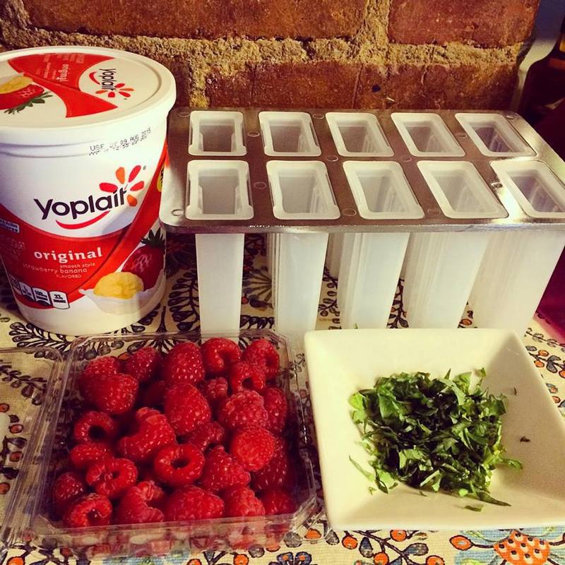 Just mix your Yoplait® Yogurt, raspberries, and basil together. Then carefully spoon it into the frozen treat mold of your choice. (I purchased this one at World Market, and it is fabulous!) Add them to the freezer for about an hour. Then, pull them out and add your popsicle sticks. This will help ensure that they will freeze properly and not fall apart when you try to remove the pops from the mold.