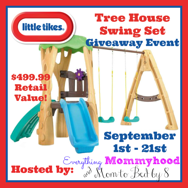 Welcome to the Little Tikes Tree House Swing Set Giveaway Event! We have come together with our hosts Everything Mommyhood and Mom To Bed by 8 to offer our readers a Tree House Swing Set giveaway from Little Tikes. Special thanks to our co-hosts Budget Earth and Bayou City Mamas. I absolutely LOVE Little Tikes! They have so much for kids, and I know my little ones would absolutely adore this swingset A backyard “tree” house with swing set that includes a climbing wall, sliding board and more! Kids can climb to the platform two different ways, the climbing wall or by climbing the tree trunk then they can slide down and do it again and again! Your kids will get years of enjoyment from this fun and durable swing set. Perfect for children ages 3-8 years old. Features Lookout tree with steering wheel Climbing wall Kids can climb the tree trunk Grab handles molded into the tree trunk Fun slide Swingset extension Maximum number of kids on climber: 4 Maximum child per swing: 1 Weight limit up to 81lbs. per child The Tree House Swing Set must be anchored Accessories included: Anchor kit and 2 Swings Assembly Required You can check out Everything Mommyhood's more in depth review with more pictures here - Little Tikes Tree House Swing Set Review. Now for the giveaway! One lucky winner will receive a Little Tikes Tree House Swing Set, retail $499.99. Open to US Residents, 18 and up only. One entry per household/IP Address. Void where prohibited. Winner will be chosen randomly via the Giveaway Tools entry form and will be emailed. Winner will have 48 hours to claim prize before a new winner is chosen. Giveaway ends 9/21/14 at 11:59pm Eastern. Disclosure: Everything Mommyhood received the item mentioned above in exchange for her honest review & giveaway. We were not compensated for this posting. All thoughts and opinions are those of our own and were not influenced in any way. Facebook, Twitter, Pinterest, Google, and any other social media are not affiliated with this posting or giveaway. Everything Mommyhood and contributing bloggers are not responsible for prize fulfillment or shipment. Little Tikes is responsible for fulfillment of prize. This disclosure is done in accordance with the Federal Trade Commission 10 CFR, Part 255 Guides Concerning the use of Endorsements and Testimonials in Advertising. If you have any questions about this event or would like to see your event hosted by Everything Mommyhood, please email [email protected].