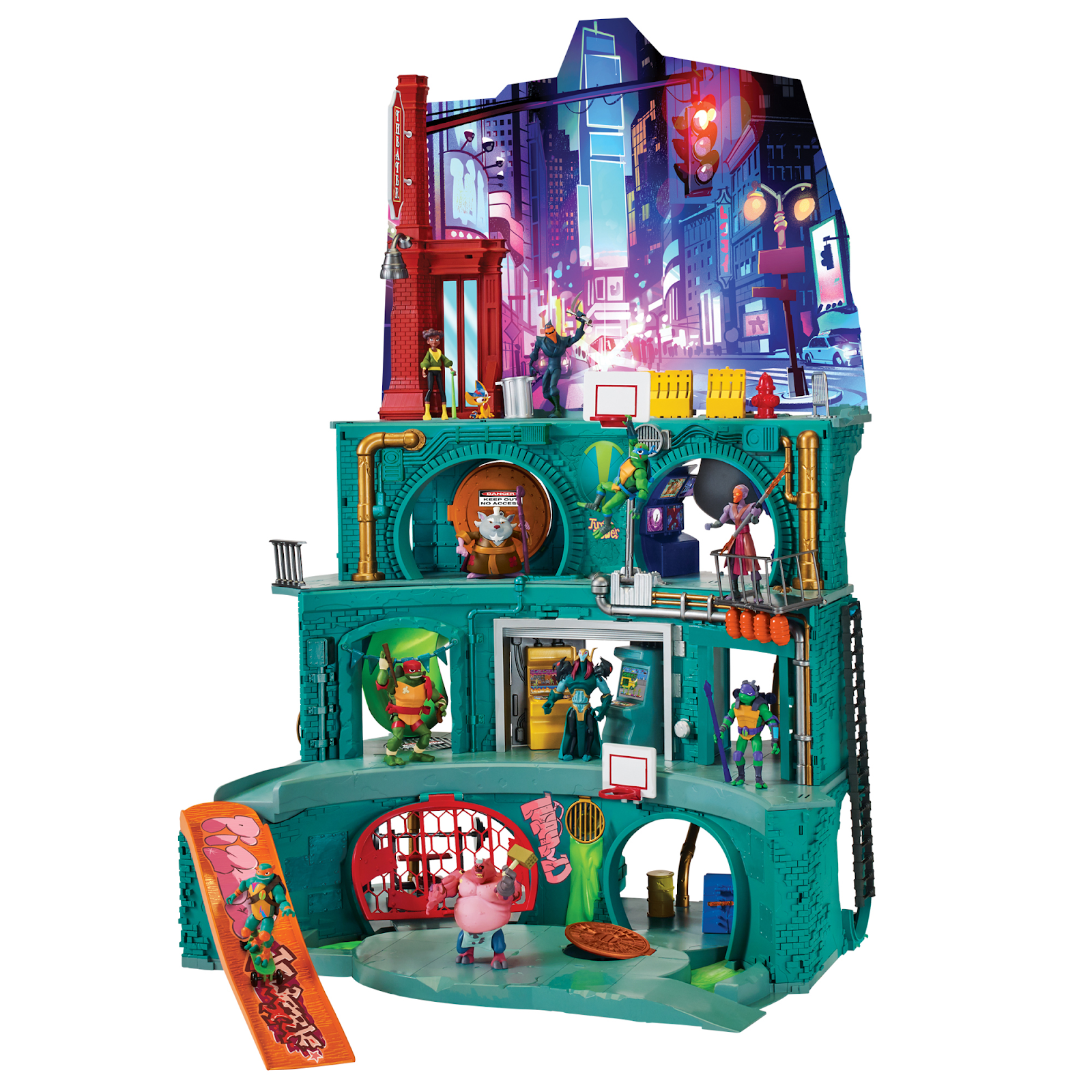 Features include: Splinter’s Dojo, Raphael’s Weight Training Room, Leonardo’s Rotating Weapon storage wall, Michelangelo’s arcade, the catapult Basketball hoop, hidden projectile launchers for villain invasions, rotating skateboard ramp, collapsing balcony, and so much more.